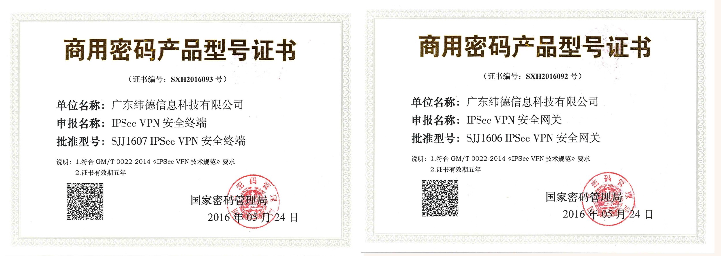 近日,广东纬德“IPSec VPN安全网关”及“IPSec VPN安全终端”通过了国家密码局的商用密码组织产品检测及专家鉴定,获得了由该局颁发的《商用密码产品型号证书》。目前广东纬德已经获得国家密码局颁发的《商用密码产品生产定点单位证书》、《商用密码产品销售许可证》、《商用密码产品型号证书-IPSec VPN安全网关》、《商用密码产品型号证书-IPSec VPN安全终端》共计四项证书。