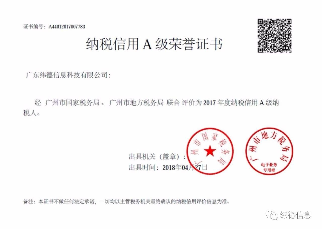 为促进依法诚信纳税,进一步优化税收营商环境,按照国家税务总局和广东省地方税务局的统一部署,广东省地方税务局将2017年度纳税信用评价结果为 A 级的纳税人名单向社会公布,广东纬德信息科技有限公司再次评为“纳税信用A级”企业!