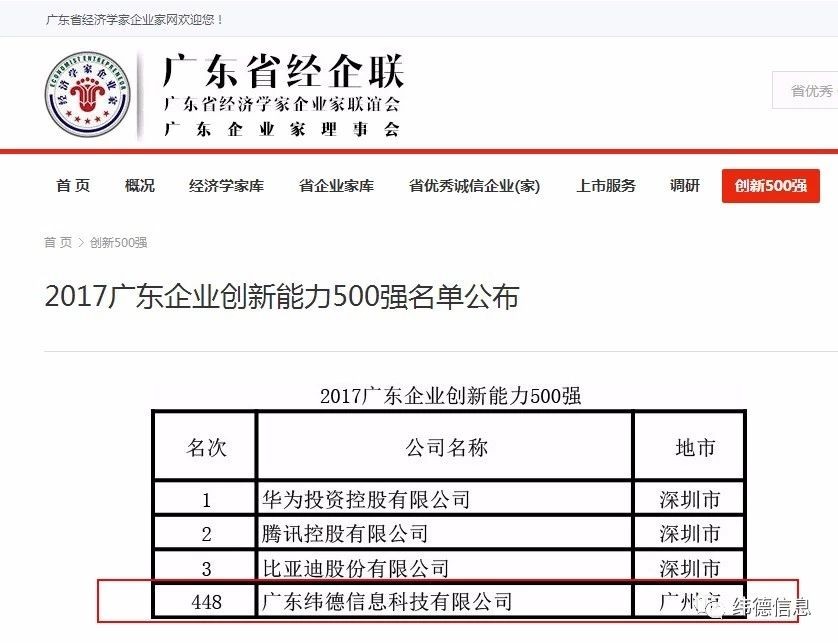 “2017广东企业创新能力500强”榜单发布,广东纬德凭借在新一代信息技术领域突出的创新能力,位列上榜500强!