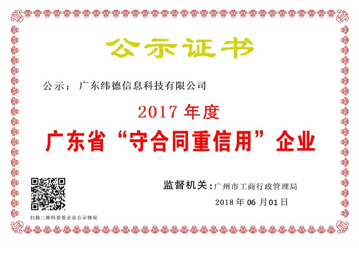 经广东省工商管理局评审,“2017年度广东省守合同重信用企业”已公开发布。广东纬德信息科技有限公司凭借自身企业实力和一贯推诚布信的企业理念顺利通过广东省工商局的最终评审,喜获“广东省守合同重信用企业”荣誉称号!
